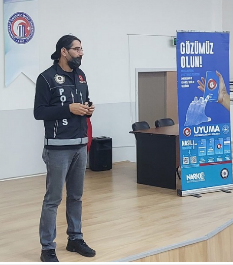 Within the scope of the "Quality Assurance Processes" carried out by our university, our students were given addiction training by Police Officer Hakan TAŞDEMİR from the Narcotics Branch Unit of Çanakkale Provincial Police Department. The award-winning short film "Two Breads" was screened. Afterwards, Taşdemir made a presentation on the subject to our students. The program ended with mutual questions and answers. We thank him for his contributions.