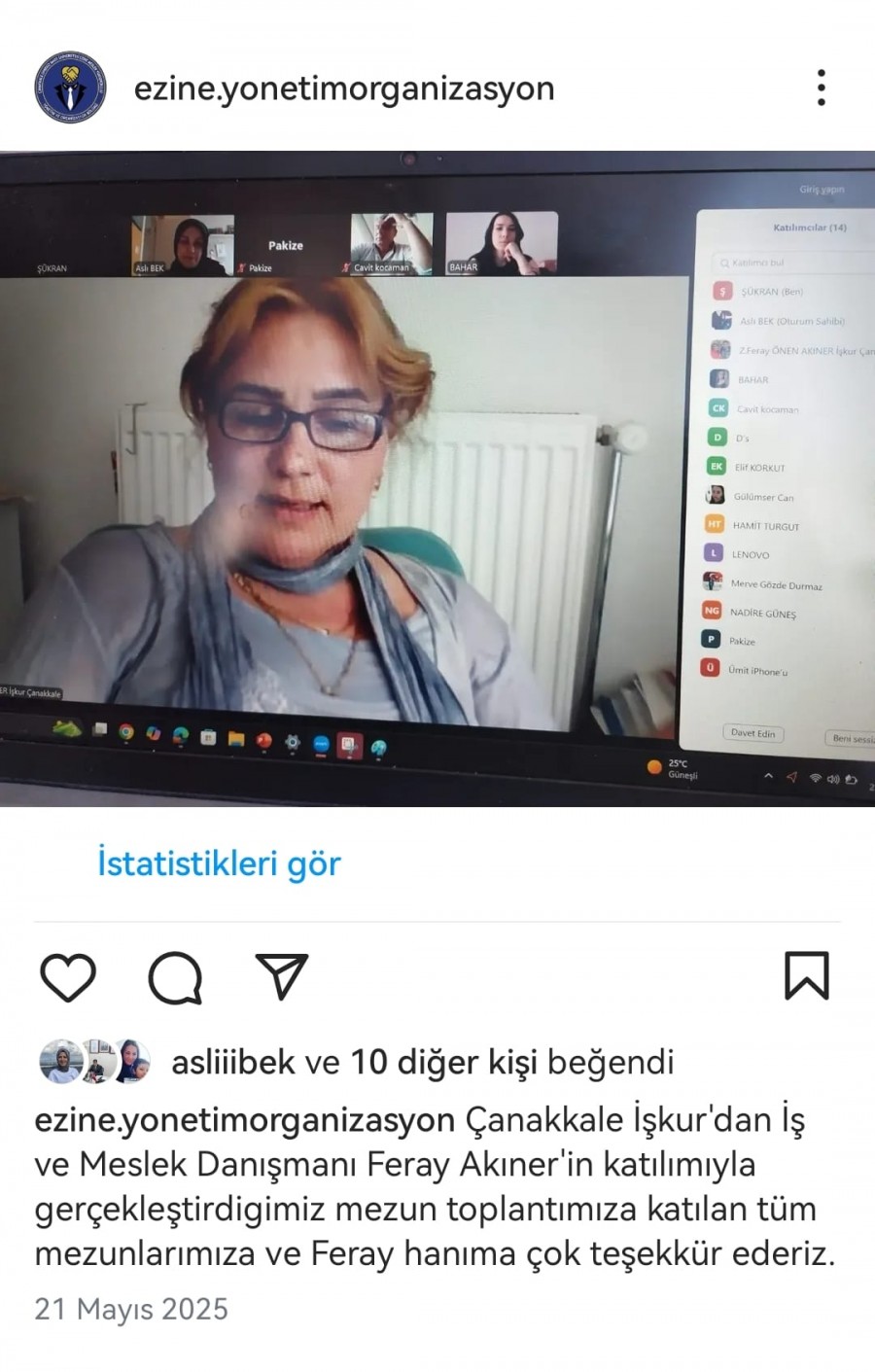 Çanakkale İskur'dan İş ve Meslek Danışmanı Feray Akıner'in katılımı ile mezunlar buluşması gerçekleştirildi.